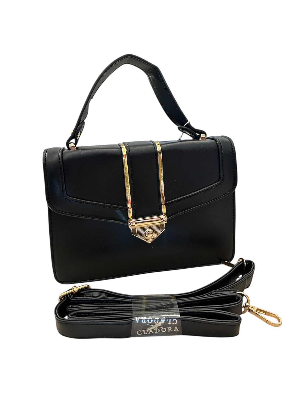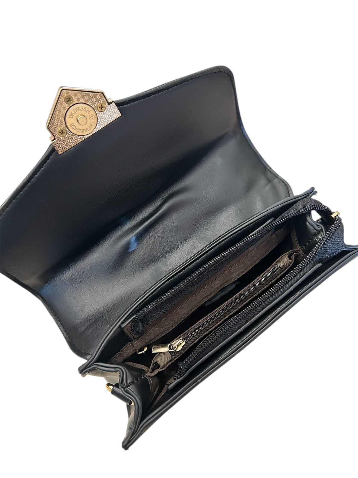 - Detalhes de Luxo: A aba do fecho é adornada por duas hastes verticais em metal dourado que emolduram o sofisticado fecho de encaixe na parte inferior. O metal dourado em contraste com o preto cria um efeito de alto luxo.