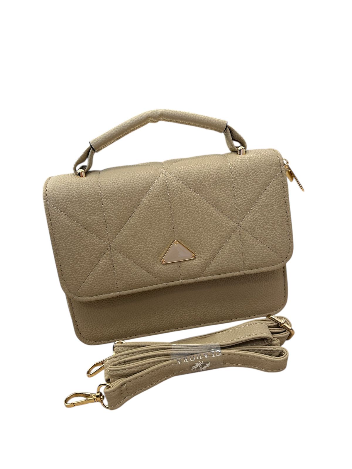 - Detalhe Geométrico: Um discreto e moderno aplique no centro do fecho, em formato triangular com base nude ou bege e bordas douradas, funciona como um ponto focal minimalista.